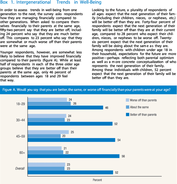 When asked to compare their current financial situation to their situation five years prior (2009), 40 percent report that they are either "somewhat better off" or "much better off," while 31 percent report doing "about the same" financially and 28 percent report being somewhat or much worse off financially. Providing some optimism about the pace of recovery, the fraction reporting that they are somewhat or much better off than five years prior increased by 9 percentage points from the 2013 survey (table 2). (For a discussion of longer-term intergenerational trends in well-being, see box 1.)