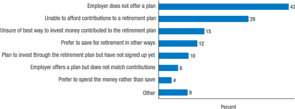 To better understand why some individuals are not saving for their retirement, the survey asks employed respondents who do not participate in a 401(k) plan (or similar) through work to state all of the reasons why they do not participate. Forty-two percent of respondents who do not participate in a plan indicate that they do not participate because their employer does not offer a plan, and 6 percent say that their employer offers a plan but does not match contributions (figure 21). The frequency of these responses is almost identical for workers of all three income levels. Twenty-nine percent of all workers, including 35 percent of workers with incomes under $40,000, say that they do not participate in a plan because they cannot afford to contribute to the plan. Additionally, 15 percent say that they do not participate in such a plan because they are unsure of the best way to invest their money in the plan, and 10 percent say that they plan to invest but have not yet signed up.