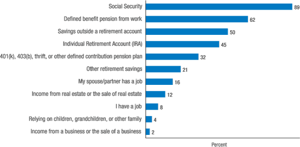 When it comes to sources of funds in retirement, 89 percent of those in retirement are drawing Social Security benefits (figure 23). Sixty-two percent are drawing a traditional defined benefit pension. Half draw on savings outside a retirement account, 45 percent use savings from an IRA, and nearly a third draw on a defined contribution plan. Twelve percent use income from real estate or the sale of real estate to fund expenses in retirement, and 8 percent currently earn wages from a job. Only 4 percent indicate that they are relying on children, grandchildren, or other family members to pay for their expenses.