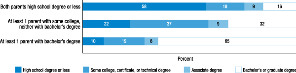 The likelihood that an individual attends college is highly correlated with the education of his or her parents. Among young adults ages 25 to 34 whose parents both have a high school degree or less, 58 percent completed no education beyond high school themselves and only 16 percent obtained at least a bachelor's degree. Among similarly aged respondents with at least one parent who received a bachelor's degree, 65 percent report that they received a bachelor's degree, whereas only 10 percent have no education beyond high school (figure 27).
