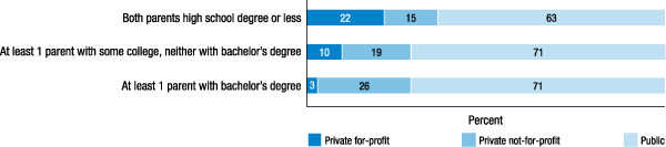 Among those who do attend college, family background also influences the type of school that they attend. Twenty-two percent of young adults ages 25 to 34 who went to college but whose parents did not report that they attended a private for-profit institution. For comparison, among respondents with at least one parent who has a bachelor's degree, 3 percent attended a for-profit institution (figure 28).34 As will be discussed later in this section and in the "Education Debt and Student Loans" section of this report, the type of institution attended appears to be correlated with both the perceived value of one's degree and the likelihood of falling behind on one's student loans.