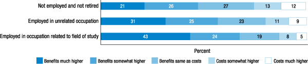 While perceptions of the value of one's education are generally positive, responses to this question vary based on the characteristics of the respondent's education. Among non-completers (respondents who attended college but failed to complete at least an associate degree), 35 percent feel that the education was worth the cost, whereas 27 percent feel that the costs outweigh the benefits.35 For those who completed at least an associate degree, the likelihood of viewing the degree as beneficial is much greater. Among these degree completers, 62 percent feel that the benefits of their education outweighed the costs, compared to just 16 percent who feel the costs outweigh the benefits.