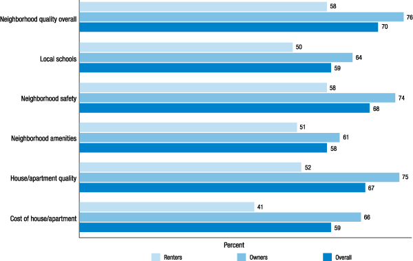 Across all measures of satisfaction, homeowners are more likely to report that they are satisfied with their house and neighborhood than are renters. Specifically, while 76 percent of homeowners are mostly or completely satisfied with their neighborhood quality overall, only 58 percent of renters report this level of satisfaction. This may reflect differences in the houses and neighborhoods where owners live relative to renters, as well as differences in the psychological commitment to a house and neighborhood required for someone to decide to purchase a given home.
