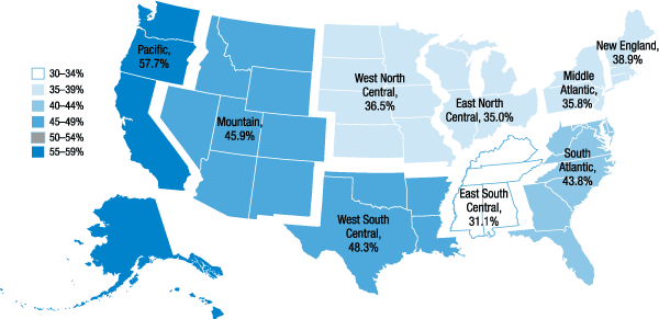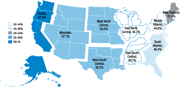 27. Census divisions are considered here, rather than states, in order to ensure sufficient sample sizes to make meaningful comparisons. Additional information on the nine census divisions is available at www.census.gov/geo/reference/gtc/gtc_census_divreg.html. Return to text