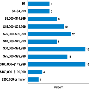 Survey respondents are asked about the income that they and their spouse or partner received in the past year from all sources. Recognizing that respondents may have imperfect recall about their income, and that some individuals are sensitive about reporting their precise income level, they are asked to provide this information in income ranges. Thirty percent of respondents report that their income in the last 12 months was less than $25,000, and 42 percent report that their income was under $40,000 (figure 5). The median family income is in the range between $40,000 and $49,999.14 The distribution of incomes varies based on individual demographic characteristics (see box 2).