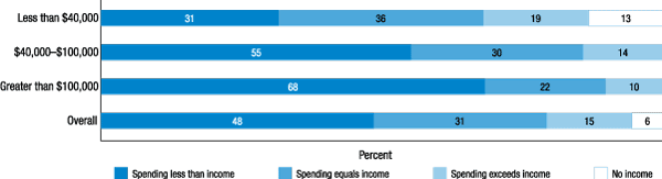 An important measure of economic well-being is whether respondents feel that they have sufficient income to cover their expenses without incurring debt. To capture the extent to which individuals feel that they are able to both pay current expenses and save for the future, the survey asks a series of questions related to their income, income sources, and rate of savings. Most respondents report that they saved at least some of their income in the year prior to the survey, although a sizeable minority indicate that their spending exceeded their income. The survey results also demonstrate that spending and savings behaviors differ greatly by income, as lower-income respondents are less likely to be saving and more likely to be spending more than they earn.