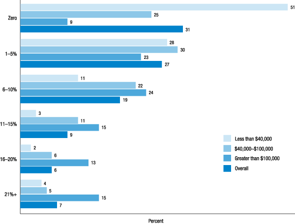 Non-retirees with higher levels of income are more likely to report that they are saving money than those lower in the income distribution. Less than half of non-retirees making under $40,000 per year report saving some of their income in the previous 12 months, whereas three-quarters of those in the middle-income group ($40,000 to $100,000) and 90 percent of those in the highest income group (over $100,000) indicate that they saved a portion of their income. Similarly, the fraction of higher-income respondents who are saving at least 10 or 20 percent of their income outpaces the frequency of such high rates of saving for lower- or middle-income adults (figure 7).