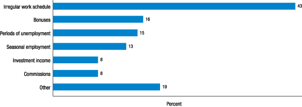 Two-thirds of respondents report that their income is roughly the same from month to month, 20 percent indicate that their monthly income varies occasionally, and 12 percent report that their income often varies quite a bit from month to month. This level of income volatility is similar to that observed in 2013, which is the most recent year in which this question was asked previously. When asked the reason their income varies, 43 percent indicate that it is due to an irregular work schedule (figure 8). Only 16 percent of those with volatile incomes attribute the volatility to bonuses, which is the next most-frequently cited reason.