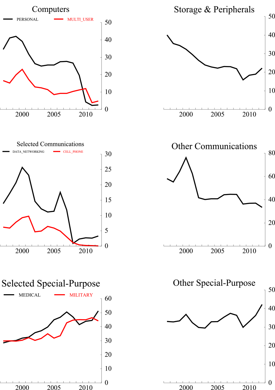 Proper measurement of the production of equipment types that are characterized by rapid innovation depends critically on the deflation of nominal output by price indexes that account for the technical advances embodied in new products. One need only observe the imagery currently available for medical diagnosis or the nature of modern military intelligence to see this is a first-order concern for special-purpose electronics, but there has been little research into measuring technical change for these types of equipment--unlike computing and communications electronics, which have been closely examined by statistical agencies and academic economists.4 Prices for the types of computing and communications equipment that have been the subject of careful studies typically fall 10-25 percent per year; in stark contrast, prices for special-purpose equipment decline much more slowly or edge up over time (table 3).