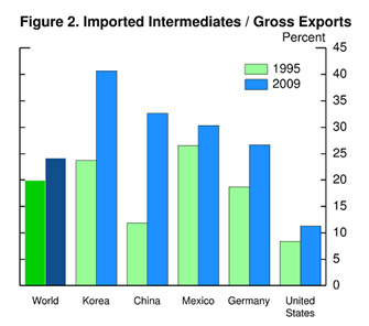 The difference between gross and value-added export shares stems from the amount of imported intermediates embodied in gross exports. As shown in Figure 2, for the world as a whole in 2009 (the blue bar), about one-quarter of gross exports consisted of imported intermediates, up from about one-fifth in 1995 (the green bar). Among individual countries, Korea and China in particular have embraced production sharing, with China's use of imported intermediates in its exports more than doubling to about one-third over this period. By contrast, for the United States, imported intermediates make up only 11 percent of gross exports, reflecting the relatively small role that international production sharing plays in the U.S. economy.