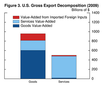 The implications of this decomposition may be seen in Table 2. As shown in the first column, gross goods exports account for a greater share of total gross exports 66 percent than services exports 34 percent. However, expressed on a value-added basis (column 2), U.S. exports of services both directly and indirectly as embodied in goods account for a larger share of total exported value-added than goods. By the same token, as shown in columns 3 and 4, on a gross basis, goods exports exceed services as a share of GDP, but this ordering is reversed on a value-added basis. All told, these calculations suggest that exports of services are a more important factor in U.S. trade and in economic activity and exports of goods a less important factor than is commonly understood.