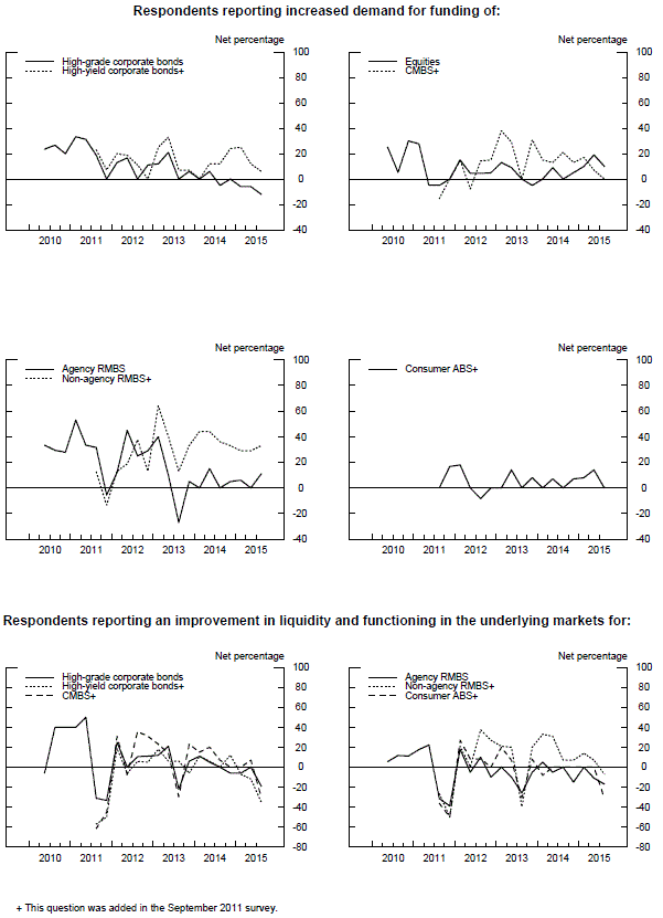 - Continuing a trend seen in recent surveys, a net fraction of one-third of dealers noted an increase in funding demand for non-agency residential mortgage-backed securities (RMBS).