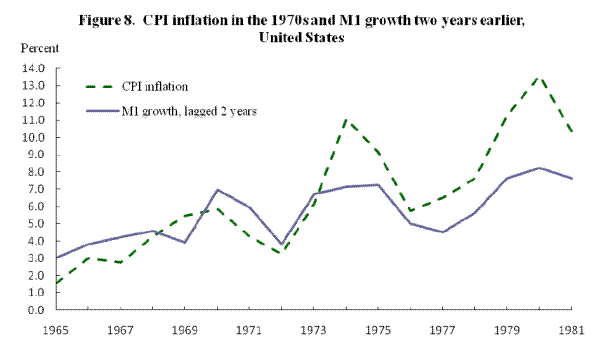 to velocity growth over these decades was, however, steady enough that it did not prevent a close correlation between inflation and prior monetary growth. After 1981, the trend of
