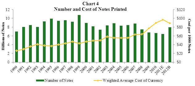 9. Charts 2-4 in the appendix show the new currency expenses, the value and number of notes printed, and the number and cost of notes printed from 1990 through the 2012 budget period. Return to text.