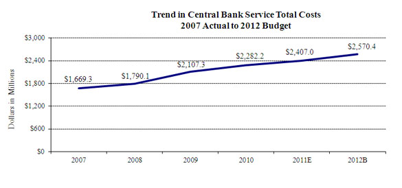 The 2012 operating budgets of the Reserve Banks total $3,441.3 million. The 2012 budget is $166.6 million, or 5.1 percent, higher than the 2011 estimate. Total 2012 projected employment for the Reserve Banks, FRIT, and OEB is 18,102 ANP, an increase of 388 ANP, or 2.2 percent, from 2011 estimated staff levels.2 The expense growth is driven by increases in central bank functions, specifically in supervision, which represents 30 percent of total expenses. Implementation of the Dodd-Frank Wall Street Reform and Consumer Protection Act (Dodd-Frank Act) continues to be a significant factor in budget growth. These increases are somewhat offset by decreases in priced services costs as a result of continued declines in check volume and associated infrastructure, and a reduction in vendor fees and staffing related to the winding down or closing of the liquidity facilities in FRB New York .3