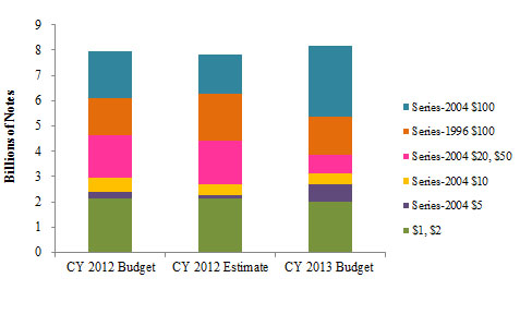 The new currency budget includes $734.8 million in printing costs for CY 2013, which represents a nearly seven percent increase from the 2012 estimate. The increase is primarily attributable to a higher volume of more-expensive new-design $100 notes.8 As shown in chart 1, the Board's 2013 calendar year budget includes approximately 1.3 billion more new-design $100 notes than the 2012 estimate.