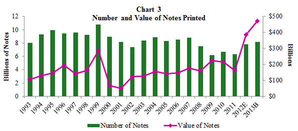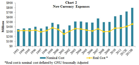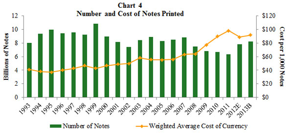 8. Charts 2-4 in the attachment show the new currency expenses, the value and number of notes printed, and the number and cost of notes printed from 1993 through the 2013 budget period. Return to text.