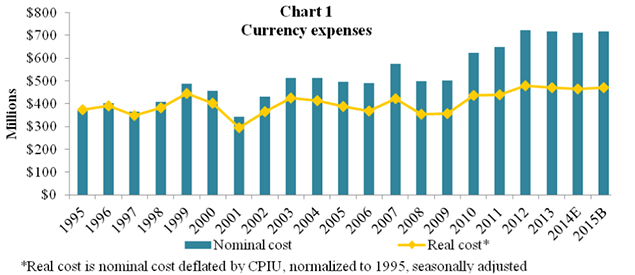 The proposed 2015 currency budget is $717.9 million, which is $108.7 million, or 13.2 percent, lower than the 2014 budget, and 0.8 percent higher than 2014 estimated expenses.4 The budgeted printing costs in 2015 are lower than the 2014 estimate and budget, reflecting lower fixed costs at the BEP. The delays in the currency reader program shifted costs from 2014 into 2015, which offset the printing cost reductions and made the 2015 budget slightly higher than the 2014 estimate.