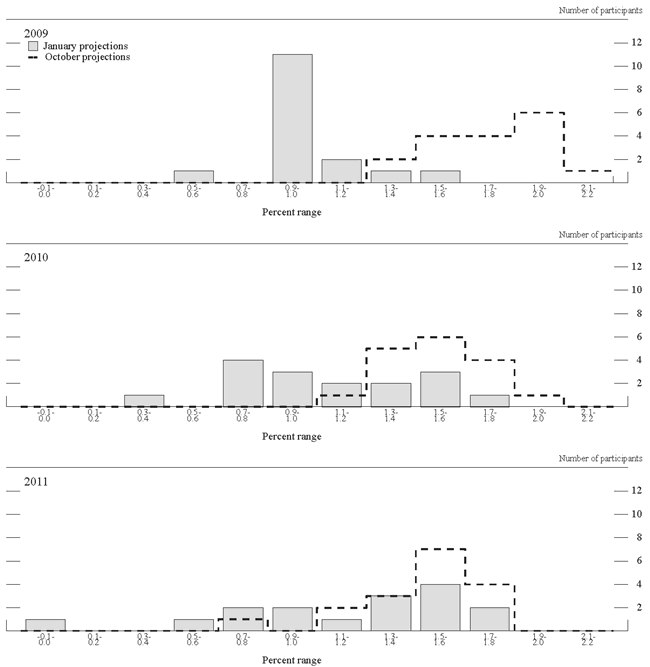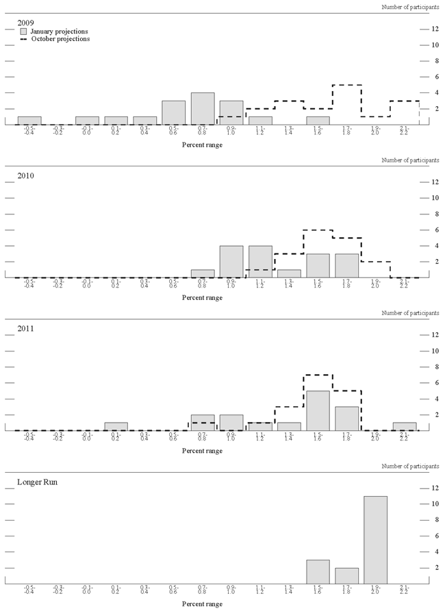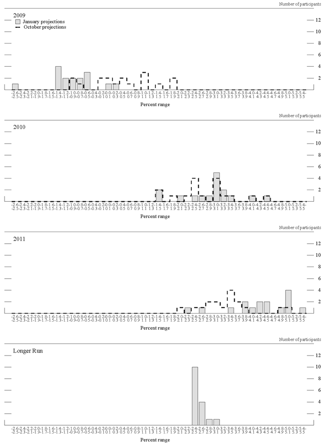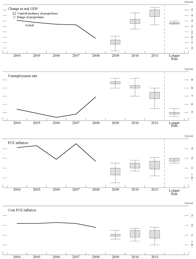 Participants' projections for the change in real GDP in 2009 had a central tendency of -1.3 to -0.5 percent, compared with the central tendency of -0.2 to 1.1 percent for their projections last October. In explaining these downward revisions, participants referred to the further intensification of the financial crisis and its effect on credit and wealth, the waning of consumer and business confidence, the marked deceleration in global economic activity, and the weakness of incoming data on spending and employment. Participants anticipated a broad-based decline in aggregate output during the first half of this year; they noted that consumer spending would likely be damped by the deterioration in labor markets, the tightness of credit conditions, the continuing decline in house prices, and the recent sharp reduction in stock market wealth, and they saw reductions in consumer demand contributing to further weakness in business investment. However, participants expected that the economy would begin to recover--albeit gradually--during the second half of the year, mainly reflecting the effects of fiscal stimulus and of Federal Reserve measures providing support to credit markets.Looking further ahead, participants' growth projections had a central tendency of 2.5 to 3.3 percent for 2010 and 3.8 to 5.0 percent for 2011. Participants generally expected that strains in financial markets would ebb only slowly and hence that the pace of recovery in 2010 would be damped. Nonetheless, participants generally anticipated that real GDP growth would gain further momentum in 2011, reaching a pace that would temporarily exceed their estimates of the longer-run sustainable rate of economic growth and would thereby help reduce the slack in resource utilization. Most participants expected that, absent further shocks, economic growth would eventually converge to a rate of 2.5 to 2.7 percent, reflecting longer-term trends in the growth of productivity and the labor force.