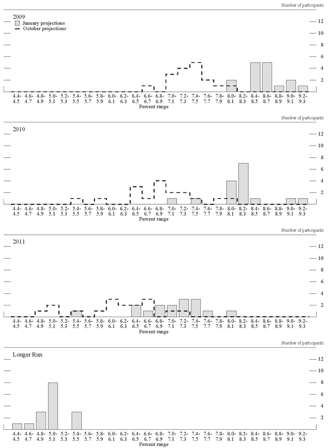 Participants anticipated that labor market conditions would deteriorate substantially further over the course of this year, and nearly all expected that unemployment would still be well above its longer-run sustainable rate at the end of 2011. Participants' projections for the average unemployment rate during the fourth quarter of 2009 had a central tendency of 8.5 to 8.8 percent, markedly higher than last December's actual unemployment rate of 7.2 percent the latest available figure at the time of the January FOMC meeting. Nearly all participants' projections were more than a percentage point higher than their previous forecasts made last October, reflecting the sharp rise in actual unemployment that occurred during the final months of 2008 as well as participants' weaker outlook for economic activity this year. Most participants anticipated that output growth in 2010 would not be substantially above its longer-run trend rate and hence that unemployment would decline only modestly next year. With economic activity and job creation generally projected to accelerate in 2011, participants anticipated that joblessness would decline more appreciably that year, as is evident from the central tendency of 6.7 to 7.5 percent for their unemployment rate projections. Participants expected that the unemployment rate would decline further after 2011, and most saw it settling in at a rate of 4.8 to 5.0 percent over time.