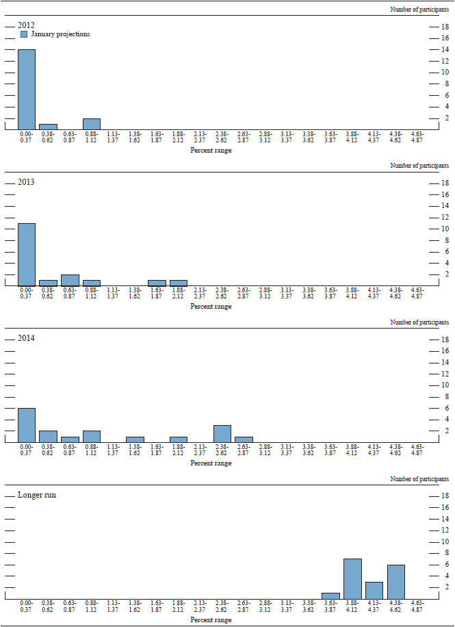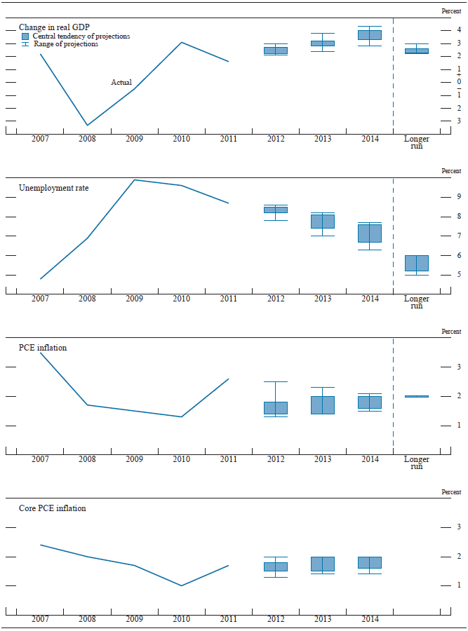 In conjunction with the January 24-25, 2012, Federal Open Market Committee (FOMC) meeting, the members of the Board of Governors and the presidents of the Federal Reserve Banks, all of whom participate in the deliberations of the FOMC, submitted projections for growth of real output, the unemployment rate, and inflation for the years 2012 to 2014 and over the longer run. The economic projections were based on information available at the time of the meeting and participants' individual assumptions about factors likely to affect economic outcomes, including their assessments of appropriate monetary policy. Starting with the January meeting, participants also submitted their assessments of the path for the target federal funds rate that they viewed as appropriate and compatible with their individual economic projections. Longer-run projections represent each participant's assessment of the rate to which each variable would be expected to converge over time under appropriate monetary policy and in the absence of further shocks. "Appropriate monetary policy" is defined as the future path of policy that participants deem most likely to foster outcomes for economic activity and inflation that best satisfy their individual interpretation of the Federal Reserve's objectives of maximum employment and stable prices.