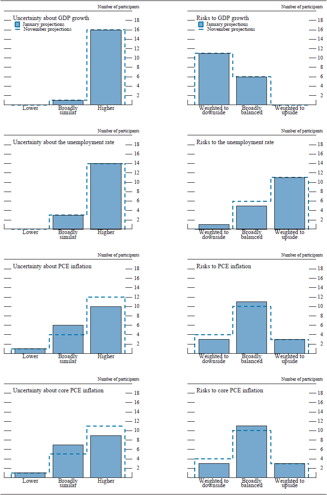A sizable majority of participants continued to judge the level of uncertainty associated with their projections for real activity and the unemployment rate as unusually high relative to historical norms. Many also attached a greater-than-normal level of uncertainty to their forecasts for inflation, but, compared with the November SEP, two additional participants viewed uncertainty as broadly similar to longer-run norms. As in November, many participants saw downside risks attending their forecasts of real GDP growth and upside risks to their forecasts of the unemployment rate; most participants viewed the risks to their inflation projections as broadly balanced.