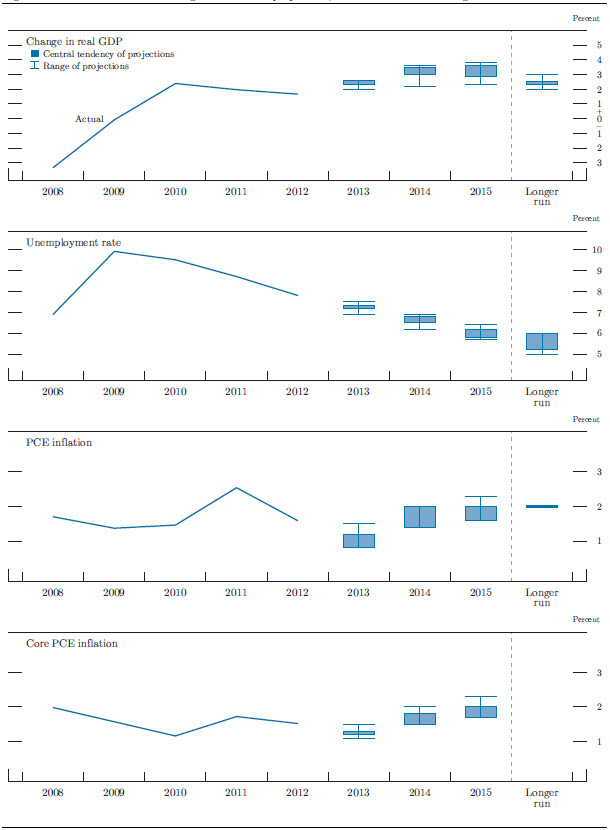 Overall, FOMC participants projected that, under appropriate monetary policy, the pace of economic recovery would gradually pick up over the 2013-15 period, and inflation would move up from recent very low readings but remain subdued (table 1 and figure 1). Almost all of the participants projected that inflation, as measured by the annual change in the price index for personal consumption expenditures (PCE), would be running at or a little below the Committee's 2 percent objective in 2015.