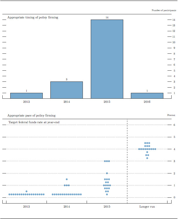 All of the participants who judged that raising the federal funds rate target would become appropriate in 2015 also projected that the unemployment rate would decline below 6-1/2 percent during that year and that inflation would remain near or below 2 percent. In addition, most of those participants also projected that a sizable gap between the unemployment rate and the longer-run normal level of the unemployment rate would persist until 2015 or later. Three of the four participants who judged that policy firming should begin in 2013 or 2014 indicated that, in their judgment, the Committee would need to act relatively soon in order to keep inflation near the FOMC's longer-run objective of 2 percent and to keep longer-run inflation expectations well anchored.