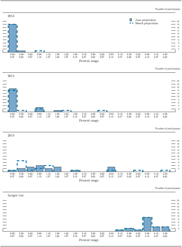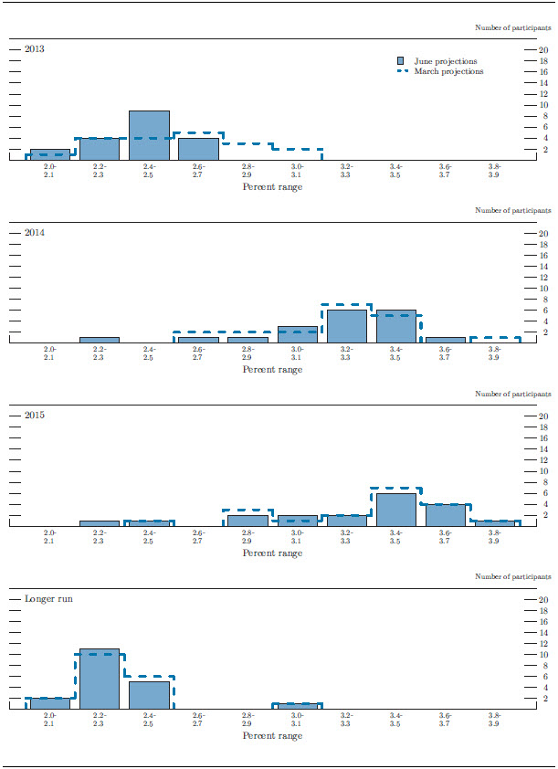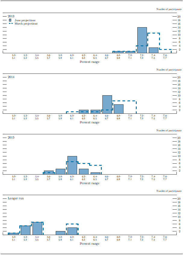 In conjunction with the June 18-19, 2013, Federal Open Market Committee (FOMC) meeting, meeting participants--the 7 members of the Board of Governors and the 12 presidents of the Federal Reserve Banks, all of whom participate in the deliberations of the FOMC--submitted their assessments of real out-put growth, the unemployment rate, inflation, and the target federal funds rate for each year from 2013 through 2015 and over the longer run.1 Each participant's assessment was based on information available at the time of the meeting plus his or her judgment of appropriate monetary policy and assumptions about the factors likely to affect economic outcomes. The longer-run projections represent each participant's judgment of the value to which each variable would be expected to converge, over time, under appropriate monetary policy and in the absence of further shocks to the economy. "Appropriate monetary policy" is defined as the future path of policy that each participant deems most likely to foster outcomes for economic activity and inflation that best satisfy his or her individual interpretation of the Federal Reserve's objectives of maximum employment and stable prices.