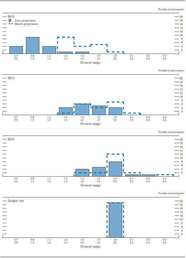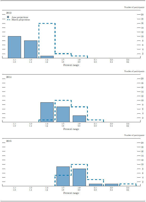 Figures 3.C and 3.D provide information on the diversity of participants' views about the outlook for inflation. The range of participants' projections for overall and core inflation in 2013 shifted down, while those ranges narrowed in 2014-15. The distributions for core and overall inflation in 2015 remained concentrated near the Committee's longer-run objective, and all participants continued to project that overall inflation would converge to the FOMC's 2 percent goal over the longer run.