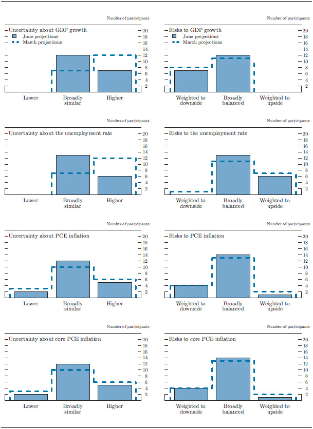 A majority of participants reported that they saw the levels of uncertainty about their projections for real GDP growth and unemployment as broadly similar to the norm during the previous 20 years, with the remainder generally indicating that they saw higher uncertainty about these economic outcomes (figure 4).2 In March, a similar number of participants had seen the level of uncertainty about real GDP growth and the unemployment rate as above average. A majority of participants continued to judge that the risks to their forecasts of real GDP growth and unemployment were broadly balanced, with the remainder generally indicating that they saw the risks to their forecasts for real GDP growth as weighted to the downside and for unemployment as weighted to the upside. The main factors cited as contributing to the uncertainty and balance of risks about economic outcomes were the limits on the ability of monetary policy to offset the effects of adverse shocks when short-term interest rates are near their effective lower bound, as well as challenges with forecasting the path of fiscal policy and economic and financial developments abroad.