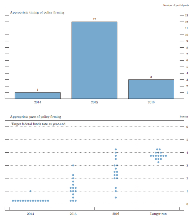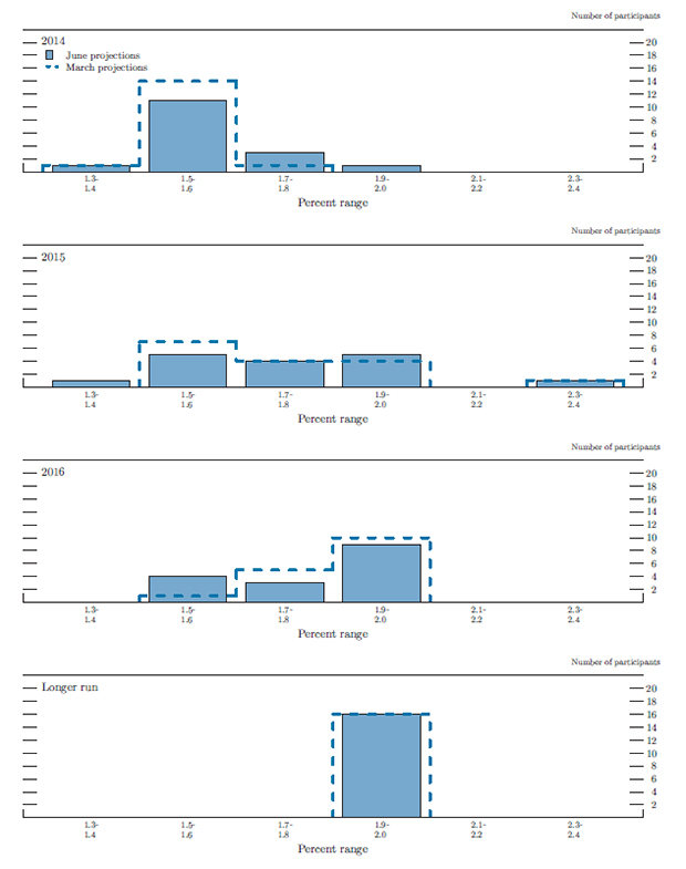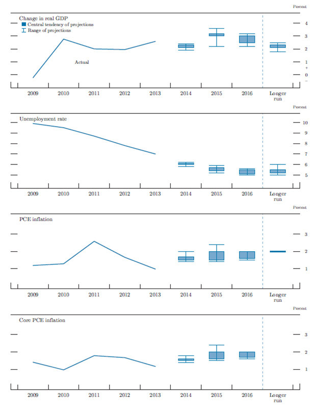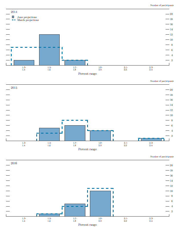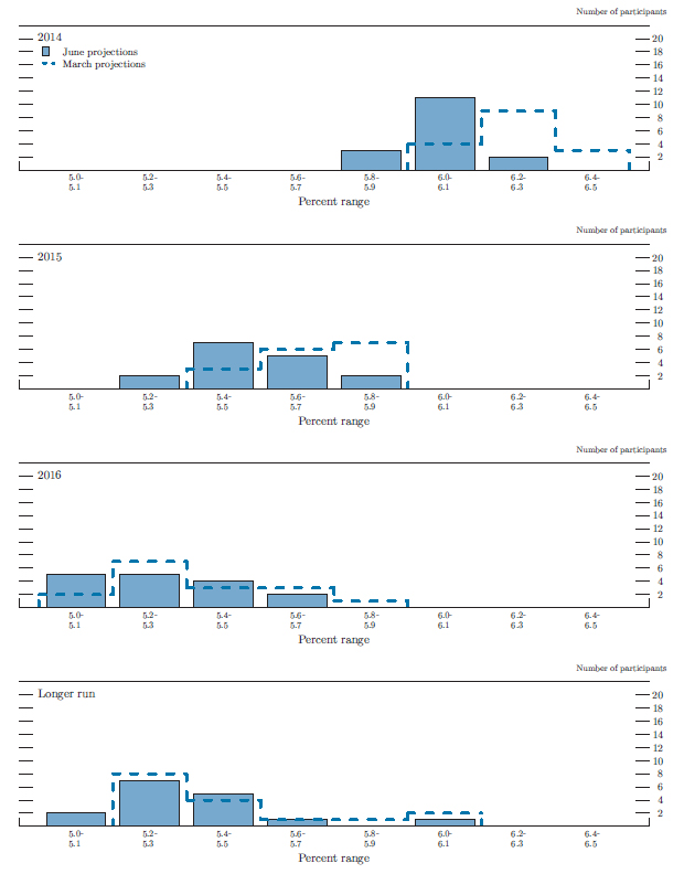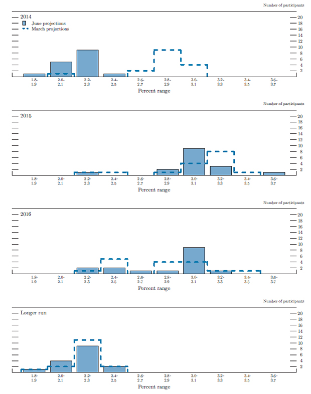 In conjunction with the June 17-18, 2014, Federal Open Market Committee (FOMC) meeting, meeting participants submitted their assessments of real output growth, the unemployment rate, inflation, and the target federal funds rate for each year from 2014 through 2016 and over the longer run.1 Each participant's assessment was based on information available at the time of the meeting plus his or her judgment of appropriate monetary policy and assumptions about the factors likely to affect economic outcomes. The longer-run projections represent each participant's judgment of the value to which each variable would be expected to converge, over time, under appropriate monetary policy and in the absence of further shocks to the economy. "Appropriate monetary policy" is defined as the future path of policy that each participant deems most likely to foster outcomes for economic activity and inflation that best satisfy his or her individual interpretation of the Federal Reserve's objectives of maximum employment and stable prices