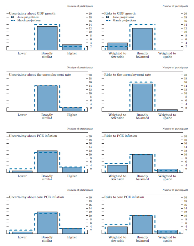 Almost all participants saw the level of uncertainty and the balance of risks around their forecasts for overall PCE inflation and core inflation as little changed from March. Most participants continued to judge the levels of uncertainty associated with their forecasts for the two inflation measures to be broadly similar to historical norms, and a majority continued to see the risks to those projections as broadly balanced. A few participants, however, viewed the risks to their inflation forecasts as tilted to the downside, reflecting, for example, the possibilities that the recent low levels of inflation could prove more persistent than anticipated, and that the upward pull on prices from inflation expectations might be weaker than assumed. Conversely, two participants saw upside risks to inflation, with one citing uncertainty about the timing and efficacy of the Committee's withdrawal of accommodation.