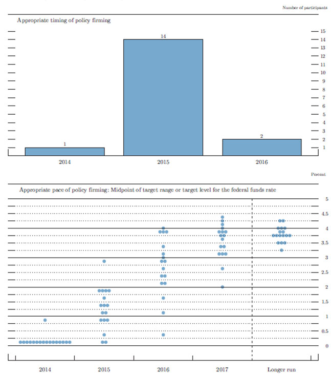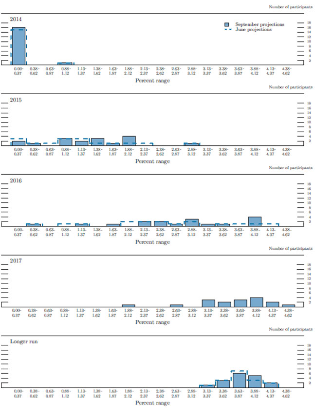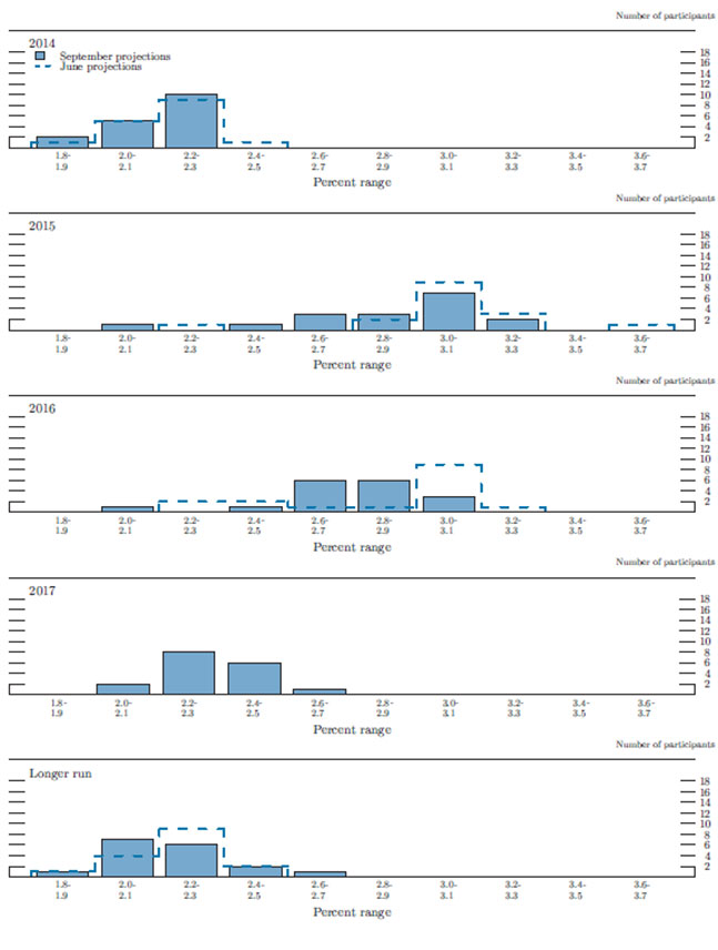 In conjunction with the September 16-17, 2014, Federal Open Market Committee (FOMC) meeting, meeting participants submitted their projections of real output growth, the unemployment rate, inflation, and the federal funds rate for each year from 2014 through 2017 and in the longer run.1 Each participant's projection was based on information available at the time of the meeting plus his or her assessment of appropriate monetary policy and assumptions about the factors likely to affect economic outcomes. The longer-run projections represent each participant's assessment of the value to which each variable would be expected to converge, over time, under appropriate monetary policy and in the absence of further shocks to the economy. "Appropriate monetary policy" is defined as the future path of policy that each participant deems most likely to foster outcomes for economic activity and inflation that best satisfy his or her individual interpretation of the Federal Reserve's objectives of maximum employment and stable prices.