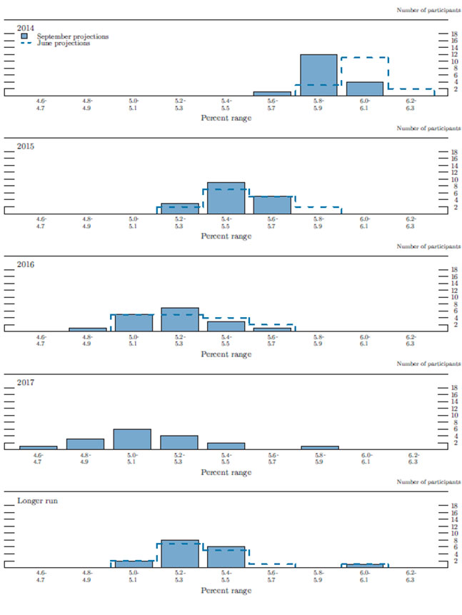 Participants anticipated that the unemployment rate would continue to decline gradually over the forecast period and, by the fourth quarter of 2017, would be close to or below their individual assessments of its longer-run normal level. The central tendencies of participants' forecasts for the unemployment rate in the fourth quarter of each year were 5.9 to 6.0 percent in 2014, 5.4 to 5.6 percent in 2015, 5.1 to 5.4 percent in 2016, and 4.9 to 5.3 percent in 2017. Participants' projected paths for the unemployment rate were slightly lower than in June, with many participants citing lower-than-expected incoming unemployment data. The central tendency of participants' estimates of the longer-run normal rate of unemployment that would prevail under appropriate monetary policy and in the absence of further shocks to the economy was unchanged at 5.2 to 5.5 percent.