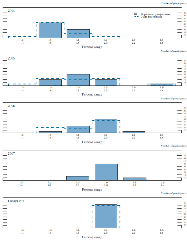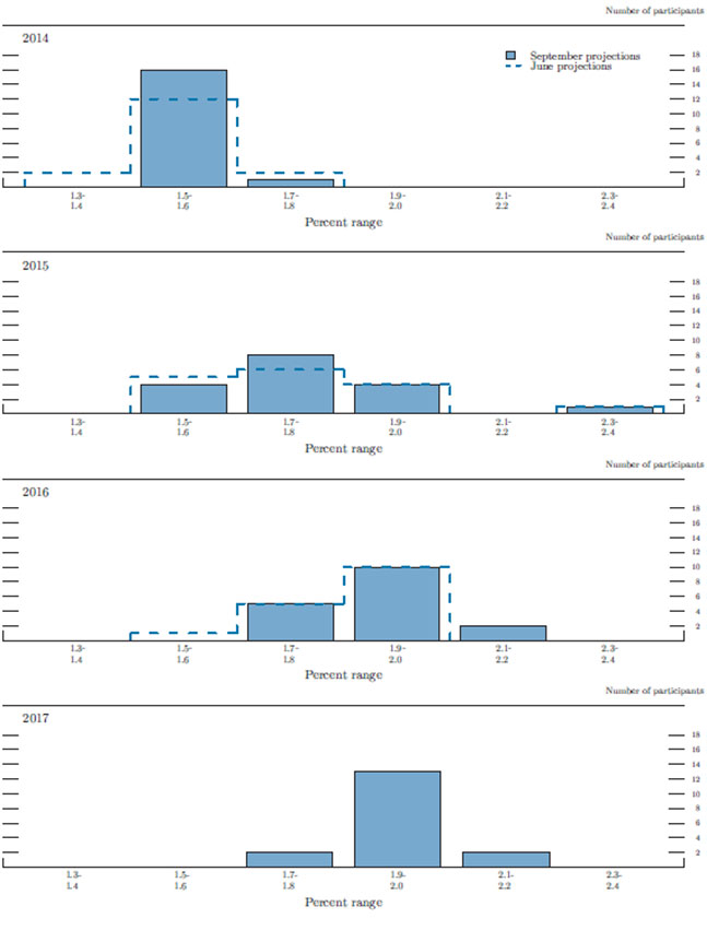 Compared with June, the central tendencies of participants' projections for inflation under the assumption of appropriate policy were largely unchanged for 2014 to 2016, and the trends anticipated over that period were generally expected to continue in 2017. Almost all participants projected that PCE inflation would rise gradually over the next few years to a level at or near the Committee's 2 percent objective. A few participants expected PCE inflation to rise somewhat above 2 percent at some point during the forecast period, while several others expected inflation to remain below 2 percent even at the end of 2017. The central tendencies for PCE inflation were 1.5 to 1.7 percent in 2014, 1.6 to 1.9 percent in 2015, 1.7 to 2.0 percent in 2016, and 1.9 to 2.0 percent in 2017. The central tendencies of the forecasts for core inflation were broadly similar to those for the headline measure. It was noted that a combination of factors--including stable inflation expectations, steadily diminishing resource slack, a pickup in wage growth, a gradual decline in the foreign exchange value for the dollar, and still-accommodative monetary policy--was likely to contribute to a gradual rise of inflation back toward the Committee's longer-run objective of 2 percent.