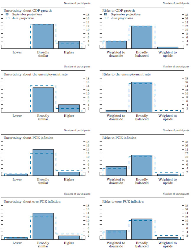 A significant majority of participants continued to judge the levels of uncertainty about their projections for real GDP growth and the unemployment rate as broadly similar to the norms during the previous 20 years (figure 4).2 Most participants continued to judge the risks to their outlooks for real GDP growth and the unemployment rate to be broadly balanced. A few participants viewed the risks to real GDP growth as weighted to the downside; one viewed the risks as weighted to the upside. Those participants who viewed risks as weighted to the downside cited, for example, concern about the limited ability of monetary policy at the effective lower bound to respond to further negative shocks to the economy. As in June, nearly all participants judged the risks to the outlook for the unemployment rate to be broadly balanced.