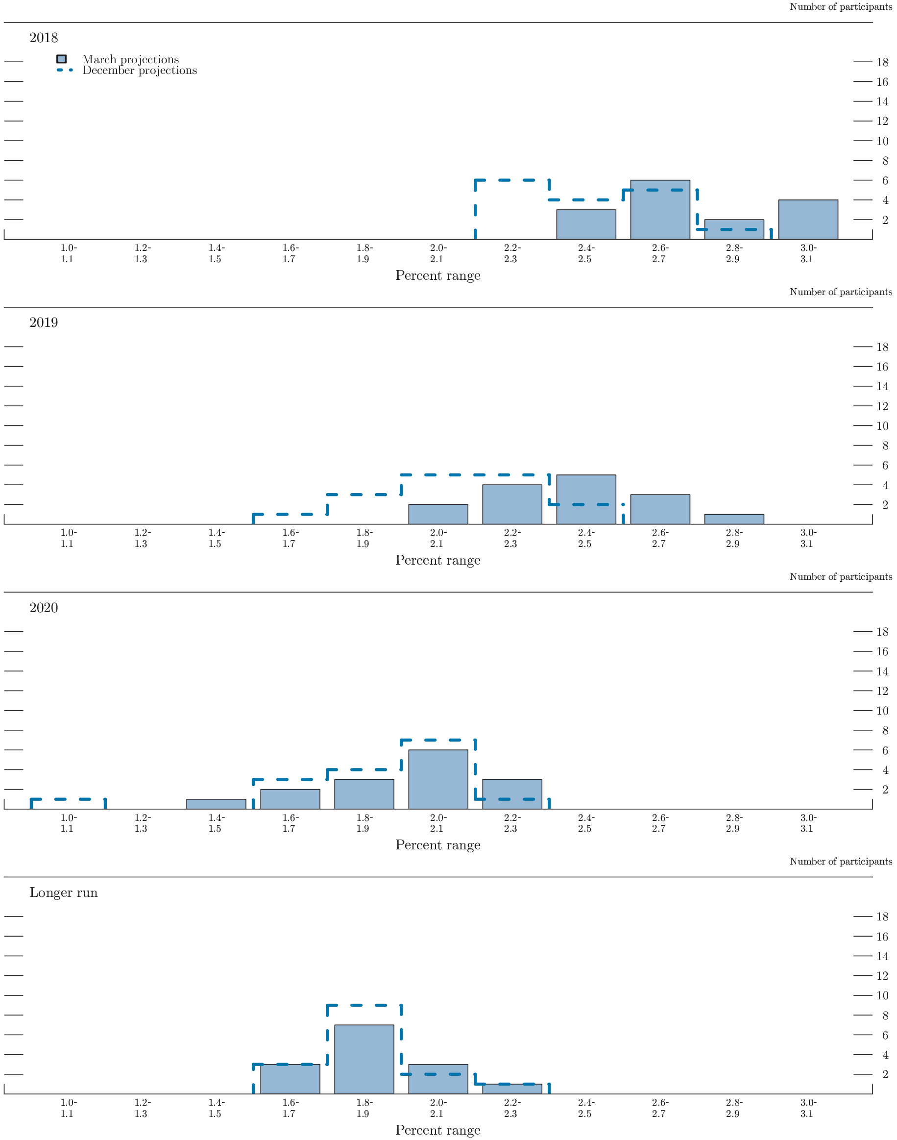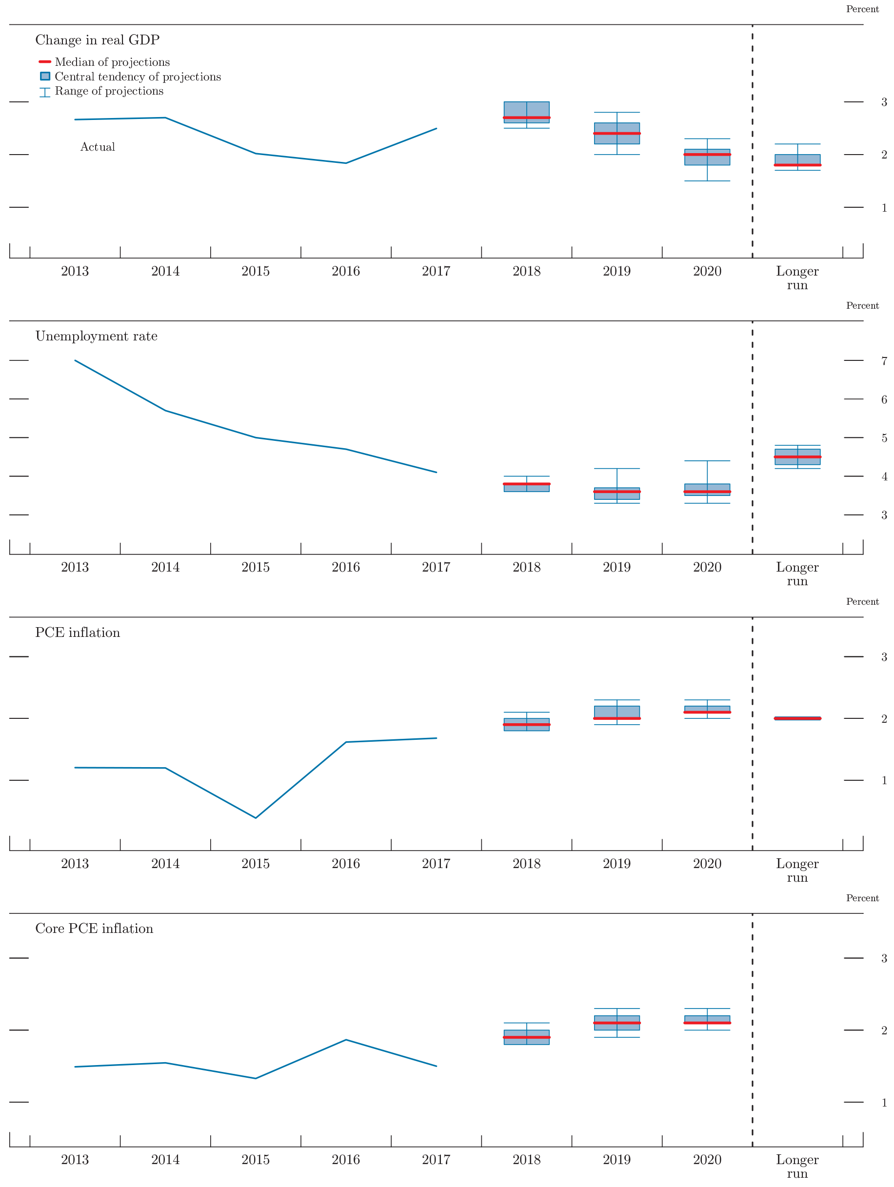 Note: Projections of change in real gross domestic product (GDP) and projections for both measures of inflation are percent changes from the fourth quarter of the previous year to the fourth quarter of the year indicated. PCE inflation and core PCE inflation are the percentage rates of change in, respectively, the price index for personal consumption expenditures (PCE) and the price index for PCE excluding food and energy. Projections for the unemployment rate are for the average civilian unemployment rate in the fourth quarter of the year indicated. Each participant's projections are based on his or her assessment of appropriate monetary policy. Longer-run projections represent each participant's assessment of the rate to which each variable would be expected to converge under appropriate monetary policy and in the absence of further shocks to the economy. The projections for the federal funds rate are the value of the midpoint of the projected appropriate target range for the federal funds rate or the projected appropriate target level for the federal funds rate at the end of the specified calendar year or over the longer run. The December projections were made in conjunction with the meeting of the Federal Open Market Committee on December 12-13, 2017. One participant did not submit longer-run projections for the change in real GDP, the unemployment rate, or the federal funds rate in conjunction with the December 12-13, 2017, meeting, and one participant did not submit such projections in conjunction with the March 20-21, 2018, meeting.