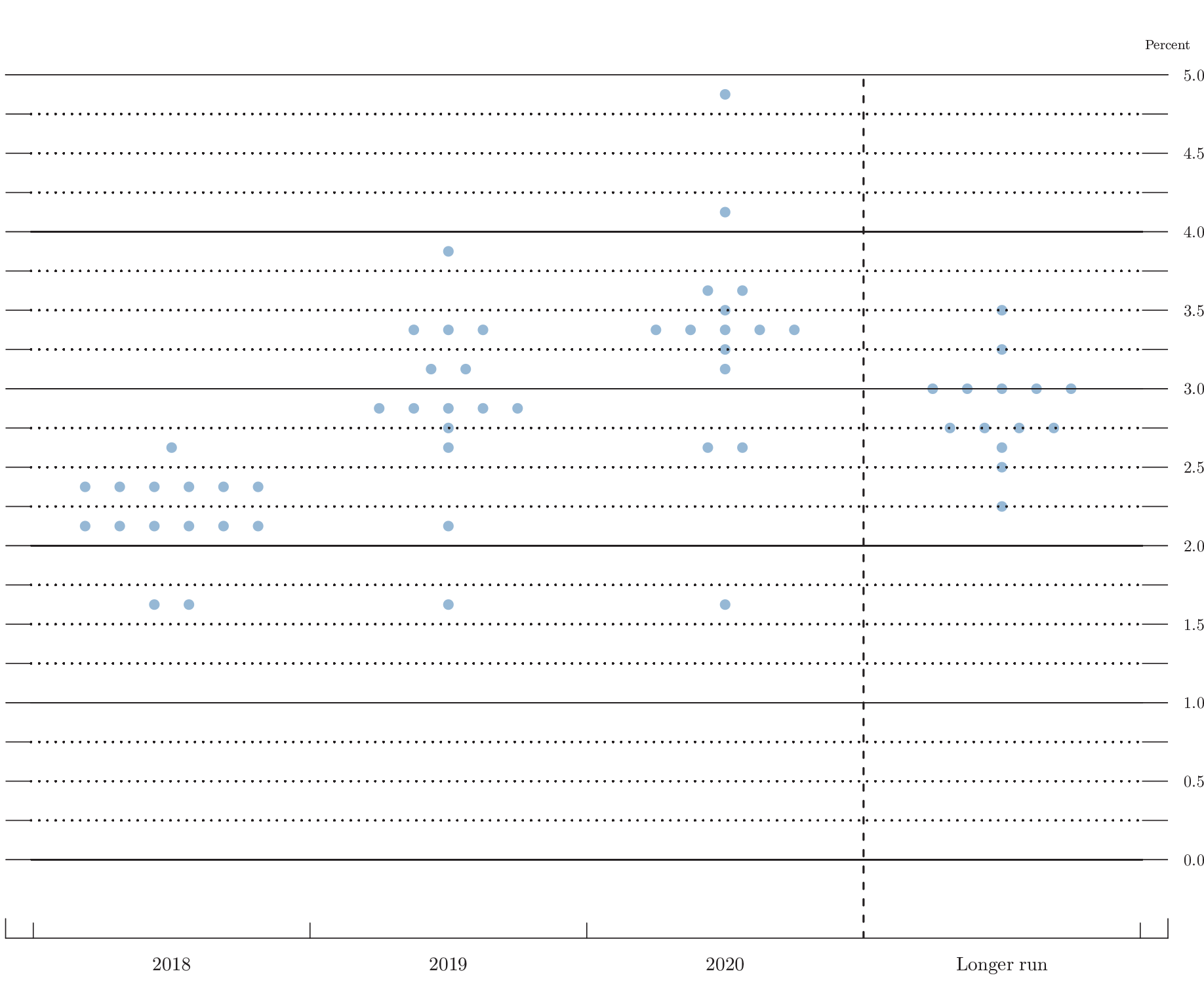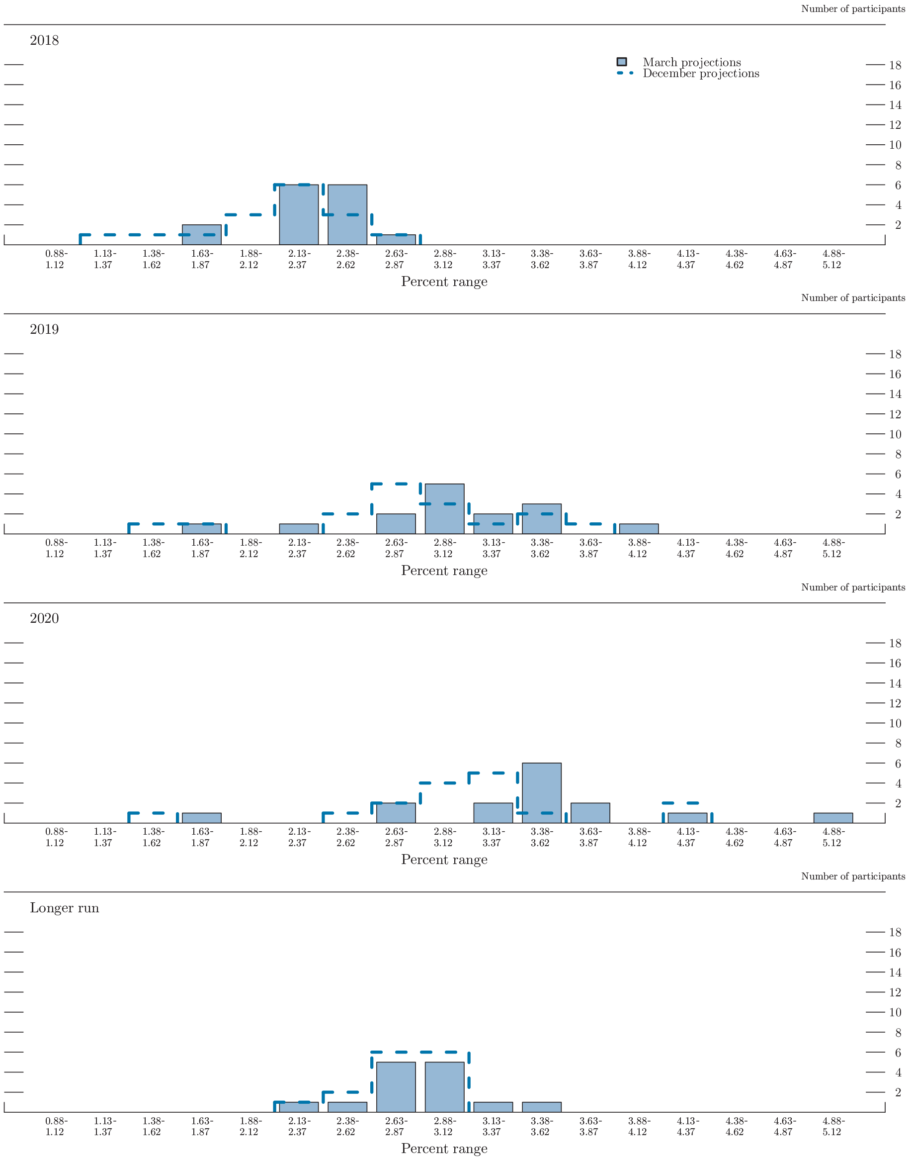 The median of participants' projections of the federal funds rate rises gradually to a level of 2.1 percent at the end of this year, 2.9 percent at the end of 2019, and 3.4 percent at the end of 2020. The median of participants' longer-run estimates, at 2.9 percent, was a bit higher than in the December SEP. Nearly all participants projected that it would likely be appropriate for the federal funds rate to rise above their individual longer-run estimates at some point over the forecast period.