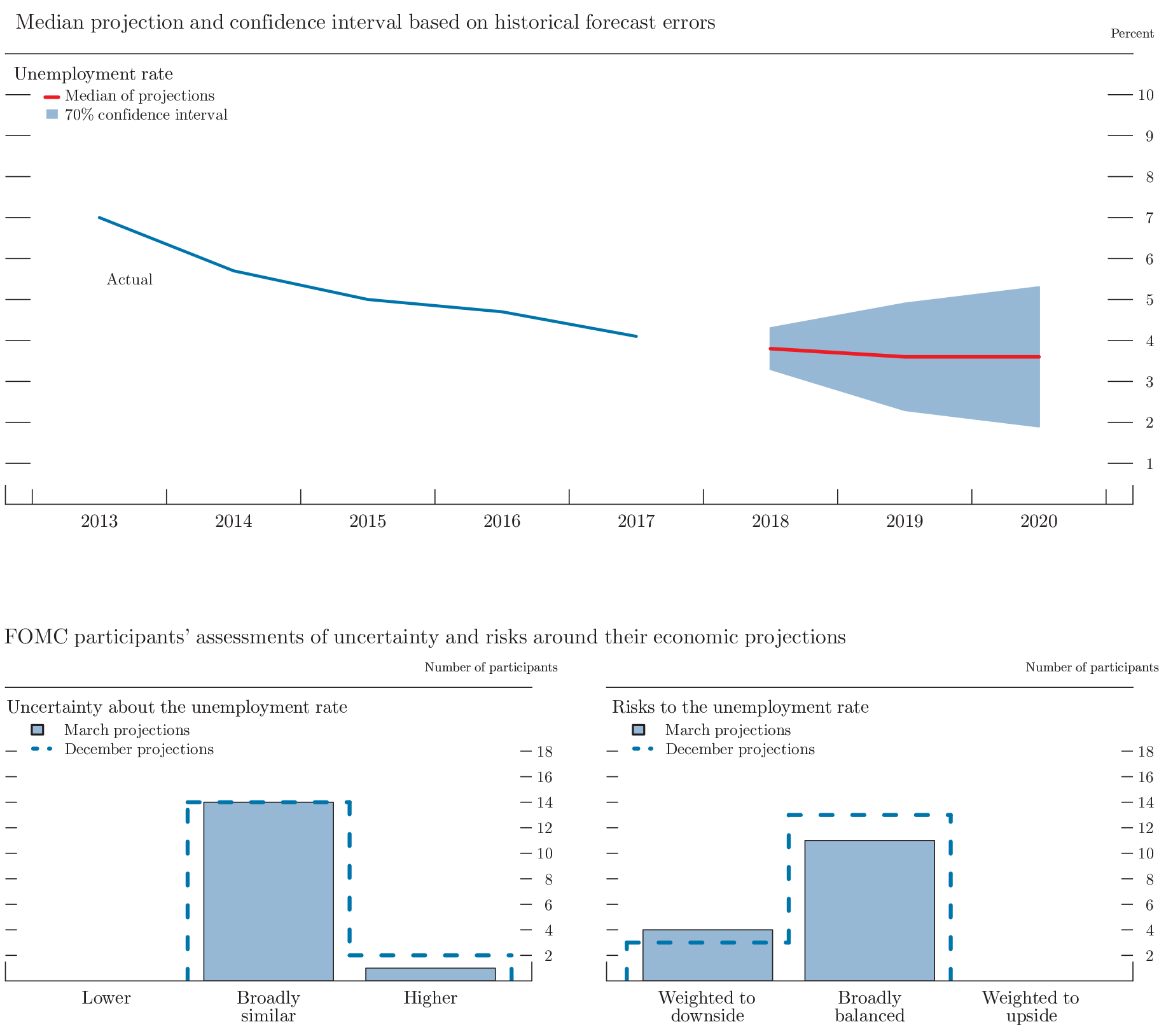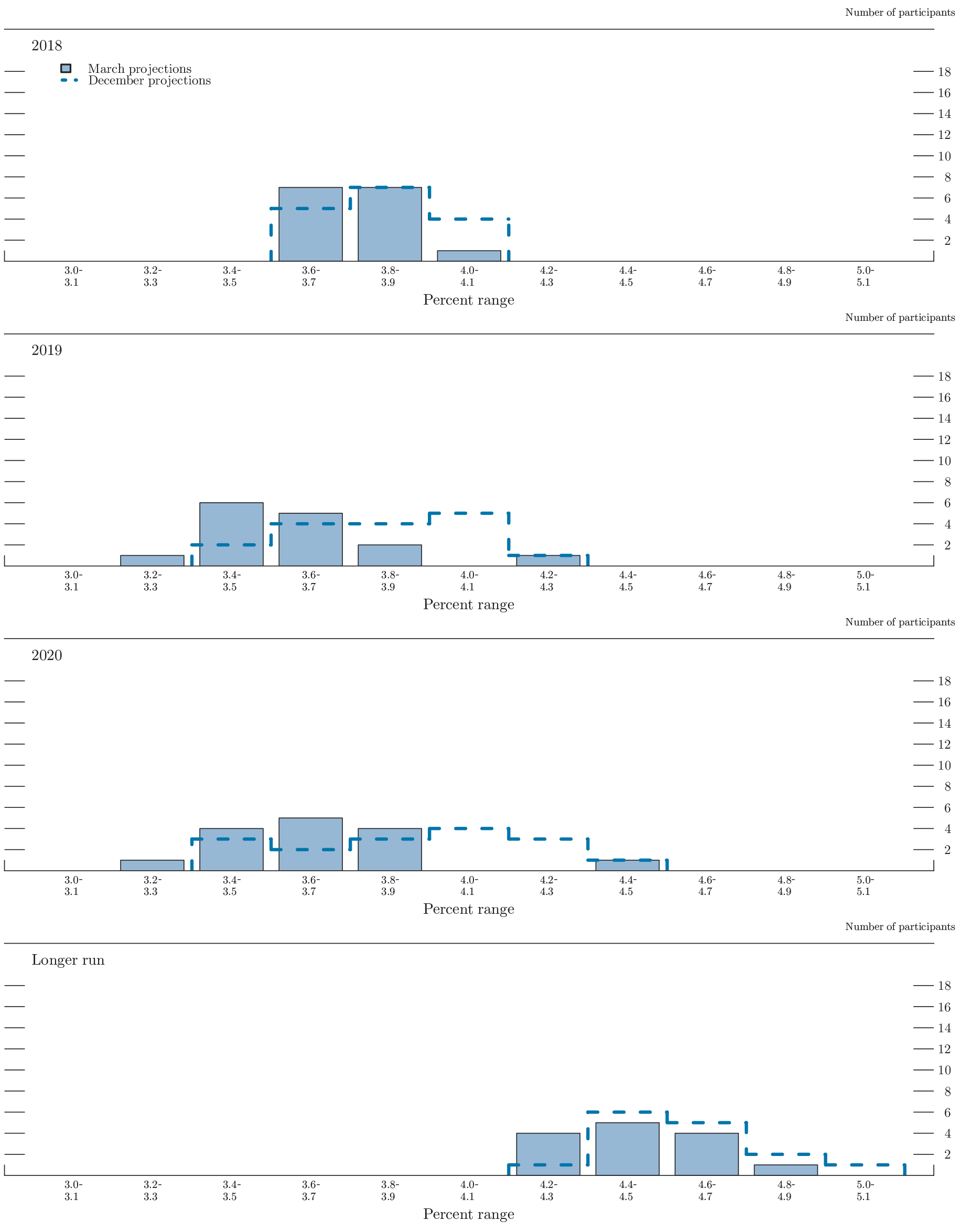 Consistent with their projections for economic activity, almost all participants expected labor market conditions to strengthen further over the projection period. The medians of projections for the unemployment rate showed that rate stepping down from 4.1 percent in the final quarter of 2017 to 3.8 percent in the final quarter of this year, and then to 3.6 percent in the final quarters of 2019 and 2020. The median of participants' estimates of the longer-run unemployment rate was 4.5 percent. Compared with the December SEP, almost all participants marked down their unemployment rate projections. Some participants also lowered their estimates of the longer-run level of the unemployment rate, leading to a small decline in the corresponding median projection.