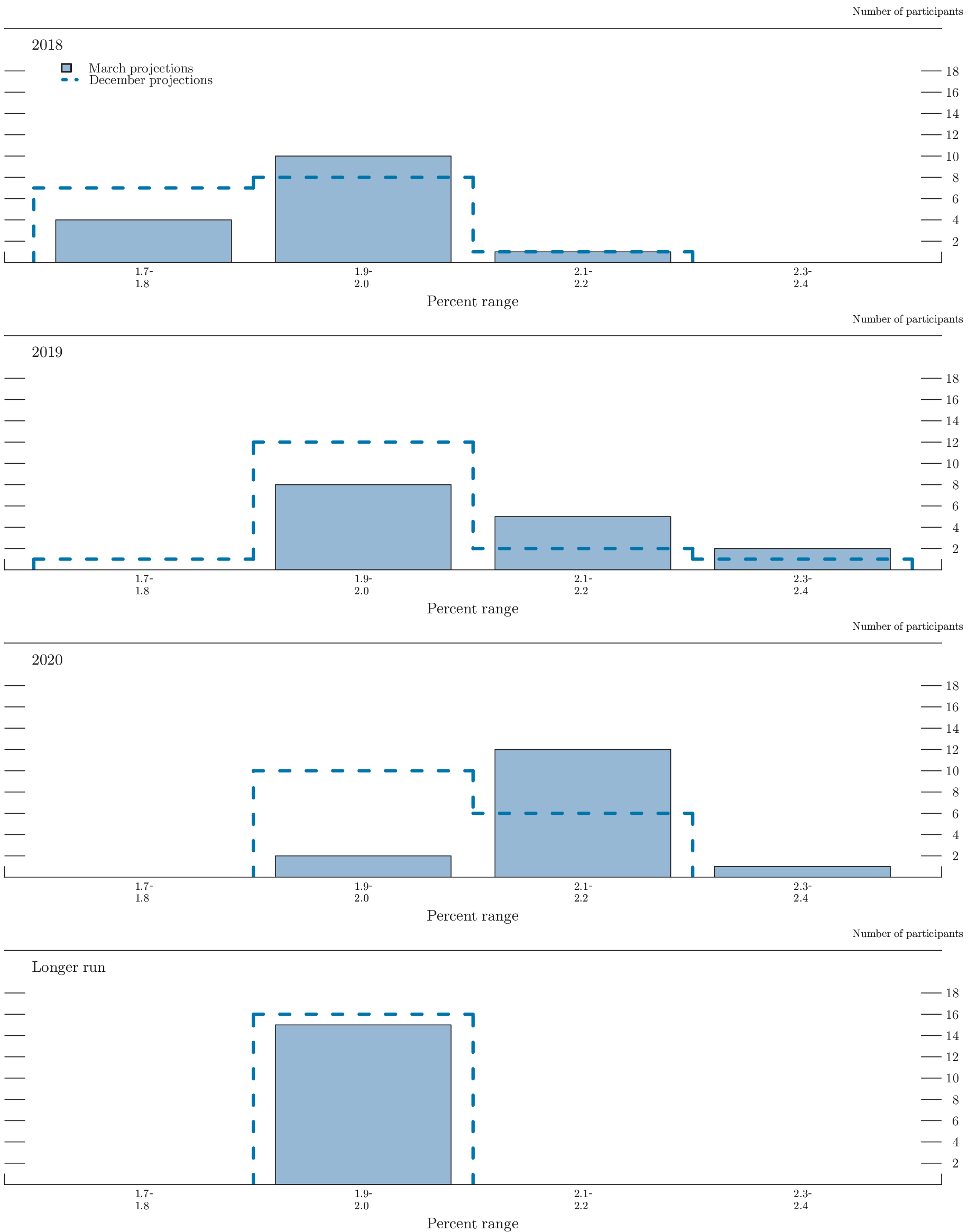The medians of participants' projections for both total and core PCE price inflation were 1.9 percent in 2018--with all participants anticipating that each measure would rise from its 2017 rate--and 2.1 percent by 2020. Compared with the December SEP, the medians of participants' projections for each measure were unchanged this year and up 0.1 percentage point in 2020.