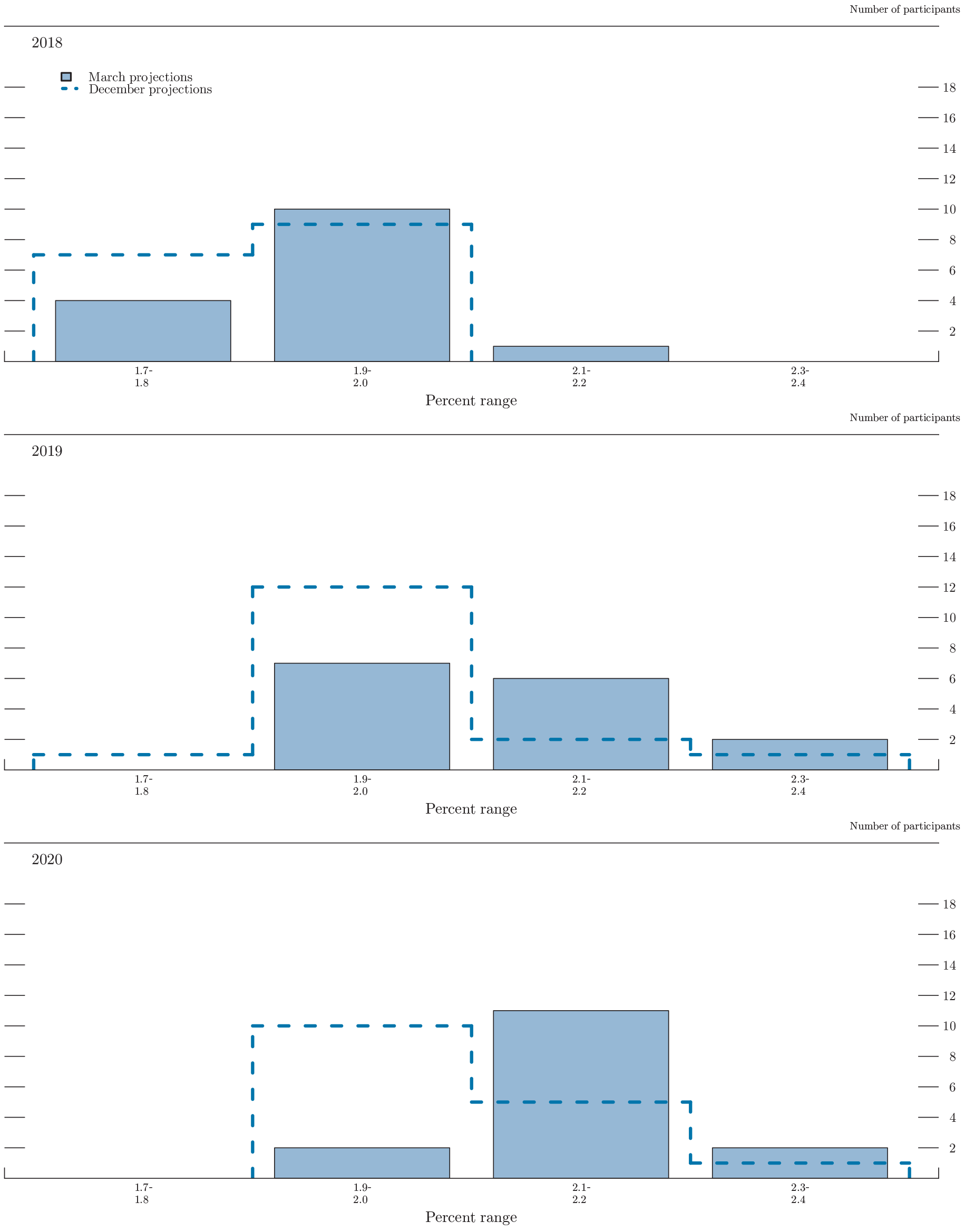 Figures 3.C and 3.D provide information on the distributions of participants' views about the outlook for inflation. Participants generally made minor upward adjustments to their inflation projections, resulting in slight shifts of the distributions to the right relative to the distributions in December. Participants generally expected each measure to increase to no more than 2 percent this year and to rise to, or edge above, 2 percent in 2019 and 2020.