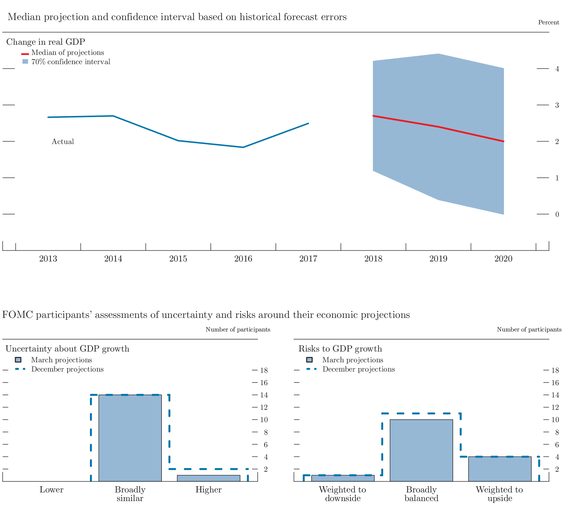 In conjunction with the Federal Open Market Committee (FOMC) meeting held on March 20-21, 2018, meeting participants submitted their projections of the most likely outcomes for real gross domestic product (GDP) growth, the unemployment rate, and inflation for each year from 2018 to 2020 and over the longer run.1 Each participant's projections were based on information available at the time of the meeting, together with his or her assessment of appropriate monetary policy--including a path for the federal funds rate and its longer-run value--and assumptions about other factors likely to affect economic outcomes. The longer-run projections represent each participant's assessment of the value to which each variable would be expected to converge, over time, under appropriate monetary policy and in the absence of further shocks to the economy.2 "Appropriate monetary policy" is defined as the future path of policy that each participant deems most likely to foster outcomes for economic activity and inflation that best satisfy his or her individual interpretation of the statutory mandate to promote maximum employment and price stability.