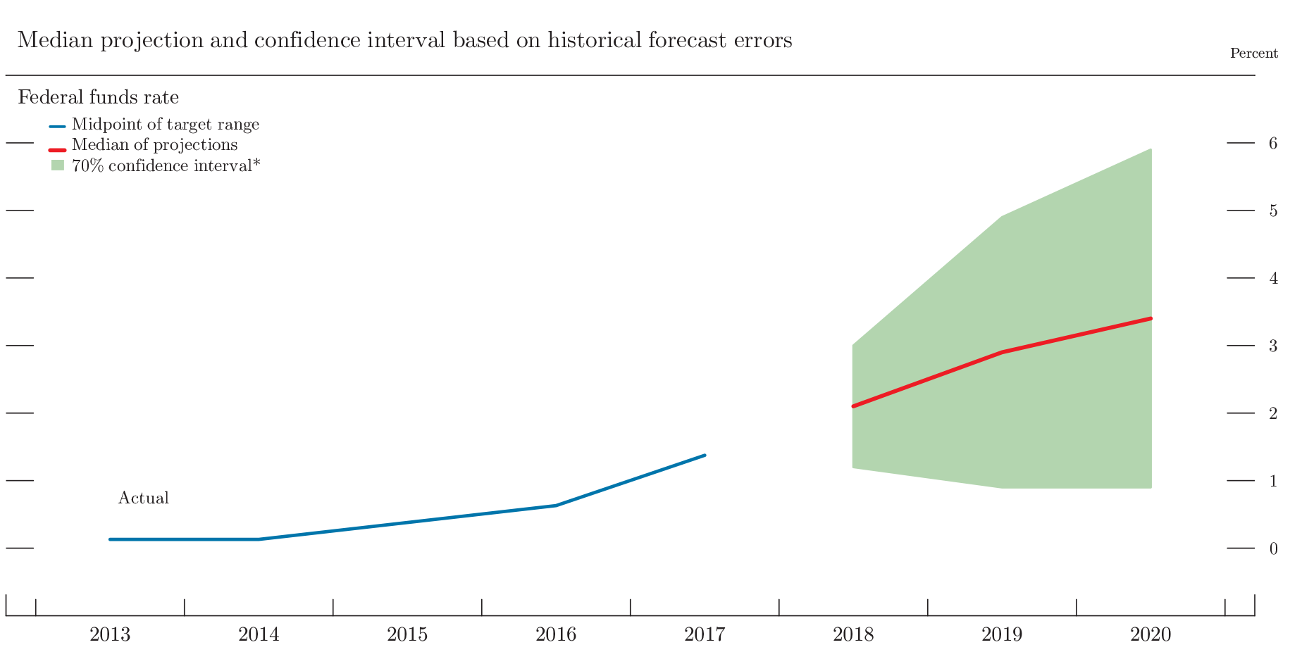 *Note: The blue and red lines are based on actual values and median projected values, respectively, of the Committee's target for the federal funds rate at the end of the year indicated. The actual values are the midpoint of the target range; the median projected values are based on either the midpoint of the target range or the target level. The confidence interval around the median projected values is based on root mean squared errors of various private and government forecasts made over the previous 20 years. The confidence interval is not strictly consistent with the projections for the federal funds rate, primarily because these projections are not forecasts of the likeliest outcomes for the federal funds rate, but rather projections of participants' individual assessments of appropriate monetary policy. Still, historical forecast errors provide a broad sense of the uncertainty around the future path of the federal funds rate generated by the uncertainty about the macroeconomic variables as well as additional adjustments to monetary policy that may be appropriate to offset the effects of shocks to the economy.