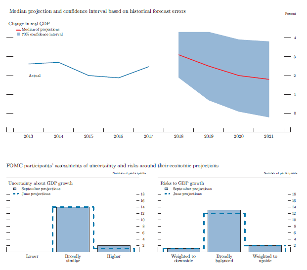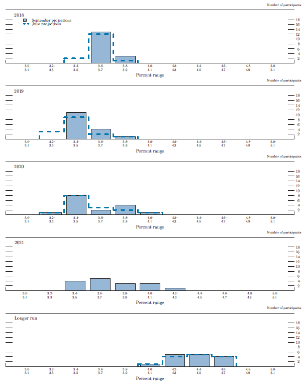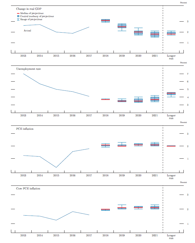 In conjunction with the Federal Open Market Committee (FOMC) meeting held on September 25–26, 2018, meeting participants submitted their projections of the most likely outcomes for real gross domestic product (GDP) growth, the unemployment rate, and inflation for each year from 2018 to 2021 and over the longer run.1 Each participant's projections were based on information available at the time of the meeting, together with his or her assessment of appropriate monetary policy--including a path for the federal funds rate and its longer-run value--and assumptions about other factors likely to affect economic outcomes. The longer-run projections represent each participant's assessment of the value to which each variable would be expected to converge, over time, under appropriate monetary policy and in the absence of further shocks to the economy.2 "Appropriate monetary policy" is defined as the future path of policy that each participant deems most likely to foster outcomes for economic activity and inflation that best satisfy his or her individual interpretation of the statutory mandate to promote maximum employment and price stability.