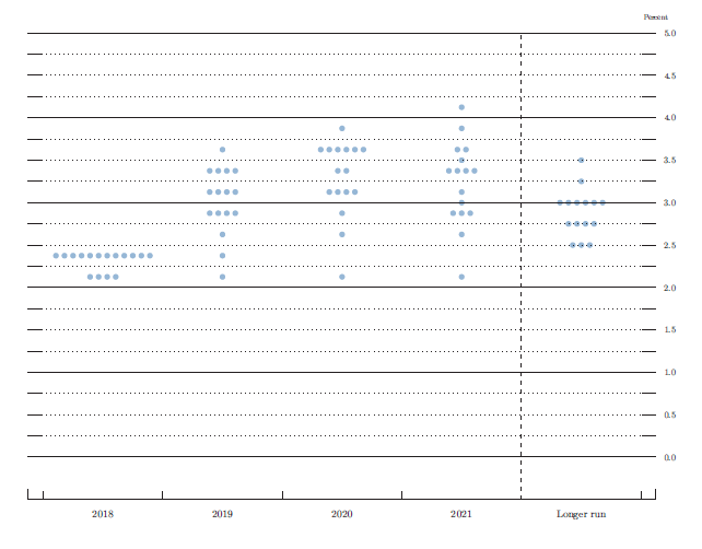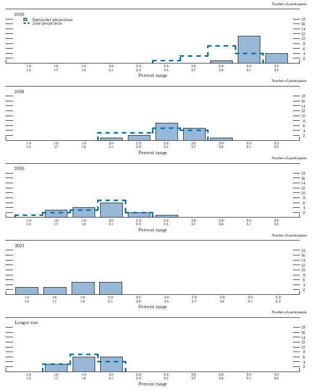 As shown in figure 2, almost all participants continued to expect that the evolution of the economy, relative to their objectives of maximum employment and 2 percent inflation, would likely warrant further gradual increases in the federal funds rate. The medians of participants' projections of the federal funds rate through 2020 were unchanged relative to their June projections, and the median of participants' projections for 2021 was the same as that for 2020. The median projection for the longer-run federal funds rate rose slightly, with several participants citing increases in model-based estimates of the longer-run real federal funds rate and strong economic data as reasons for the revision. A substantial majority of participants expected that the year-end 2020 and 2021 federal funds rate would be above their estimates of the longer-run rate.
