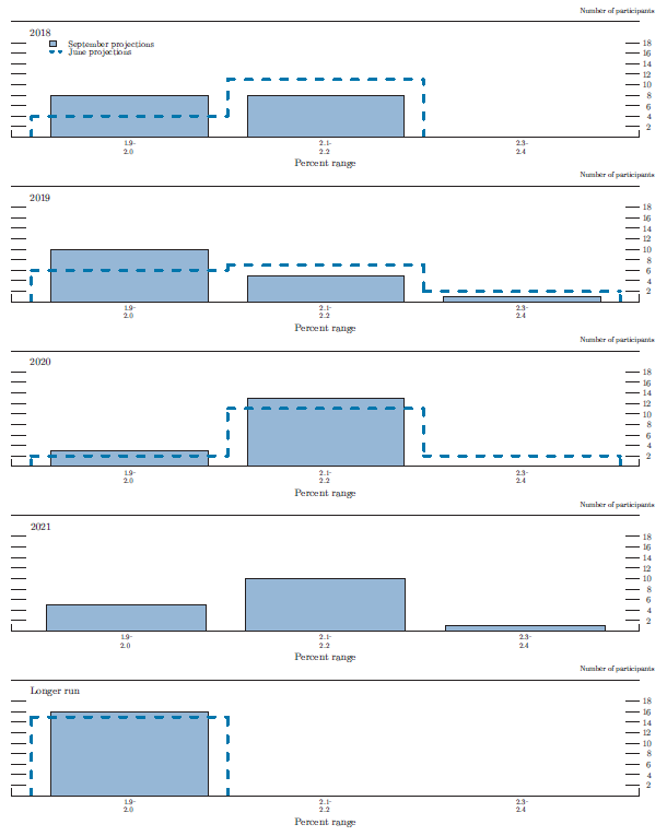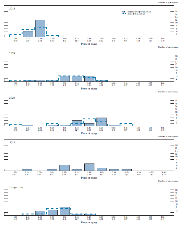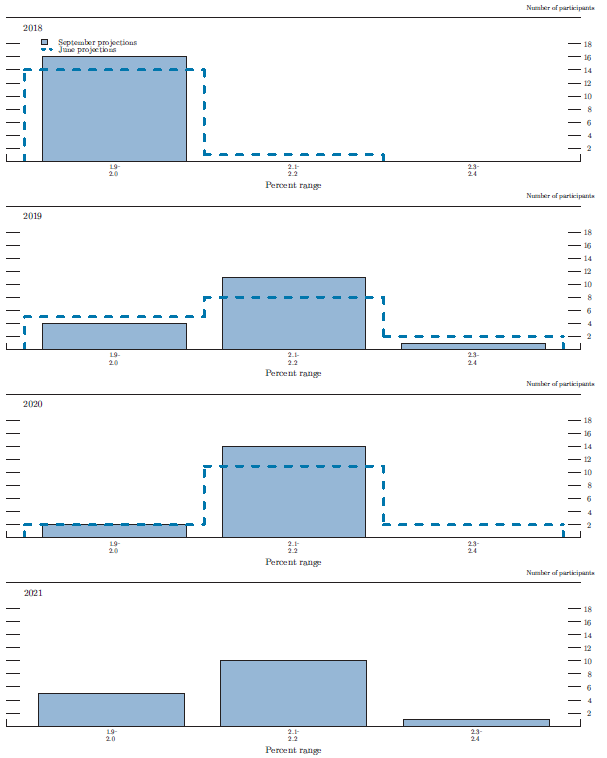 Figure 3.E shows distributions of participants' judgments regarding the appropriate target--or midpoint of the target range--for the federal funds rate for the end of each year from 2018 to 2021 and over the longer run. The distribution of projected policy rates for year-end 2018 was higher than in the June SEP, with projections clustered around 2.4 percent. The distributions of participants' views of the appropriate federal funds rate at the ends of 2019 and 2020 were relatively wide, as was the case in the June SEP.