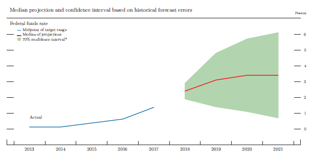 *Note: The blue and red lines are based on actual values and median projected values, respectively, of the Committee's target for the federal funds rate at the end of the year indicated. The actual values are the midpoint of the target range; the median projected values are based on either the midpoint of the target range or the target level. The confidence interval around the median projected values is based on root mean squared errors of various private and government forecasts made over the previous 20 years. The confidence interval is not strictly consistent with the projections for the federal funds rate, primarily because these projections are not forecasts of the likeliest outcomes for the federal funds rate, but rather projections of participants' individual assessments of appropriate monetary policy. Still, historical forecast errors provide a broad sense of the uncertainty around the future path of the federal funds rate generated by the uncertainty about the macroeconomic variables as well as additional adjustments to monetary policy that may be appropriate to offset the effects of shocks to the economy.