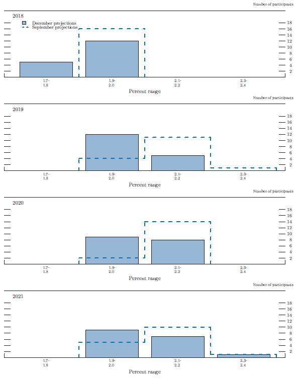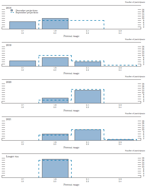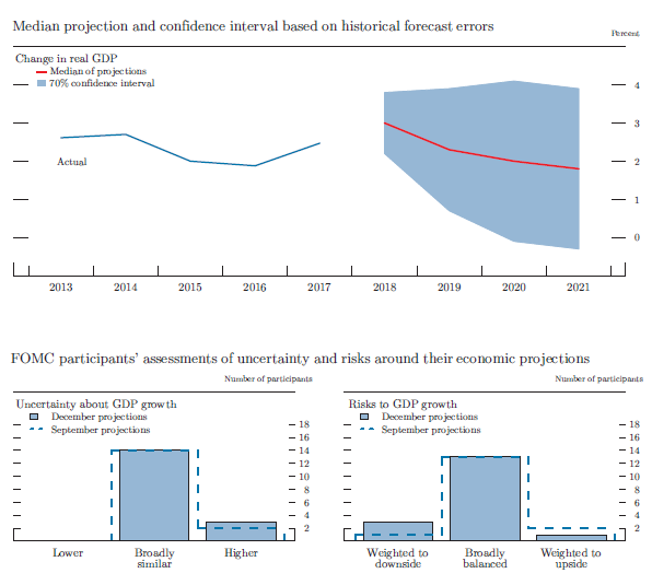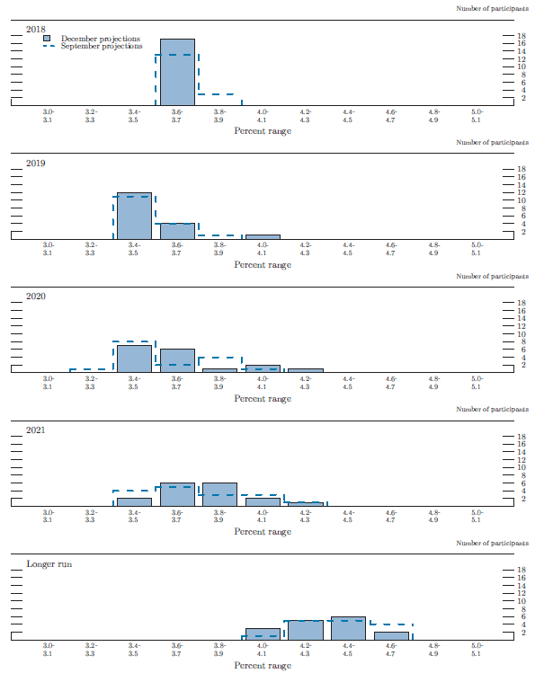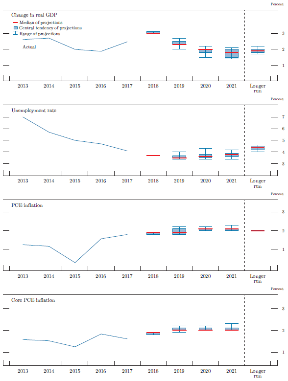 In conjunction with the Federal Open Market Committee (FOMC) meeting held on December 18-19, 2018, meeting participants submitted their projections of the most likely outcomes for real gross domestic product (GDP) growth, the unemployment rate, and inflation for each year from 2018 to 2021 and over the longer run.1 Each participant's projections were based on information available at the time of the meeting, together with his or her assessment of appropriate monetary policy--including a path for the federal funds rate and its longer-run value--and assumptions about other factors likely to affect economic outcomes. The longer-run projections represent each participant's assessment of the value to which each variable would be expected to converge, over time, under appropriate monetary policy and in the absence of further shocks to the economy.2 "Appropriate monetary policy" is defined as the future path of policy that each participant deems most likely to foster outcomes for economic activity and inflation that best satisfy his or her individual interpretation of the statutory mandate to promote maximum employment and price stability.
