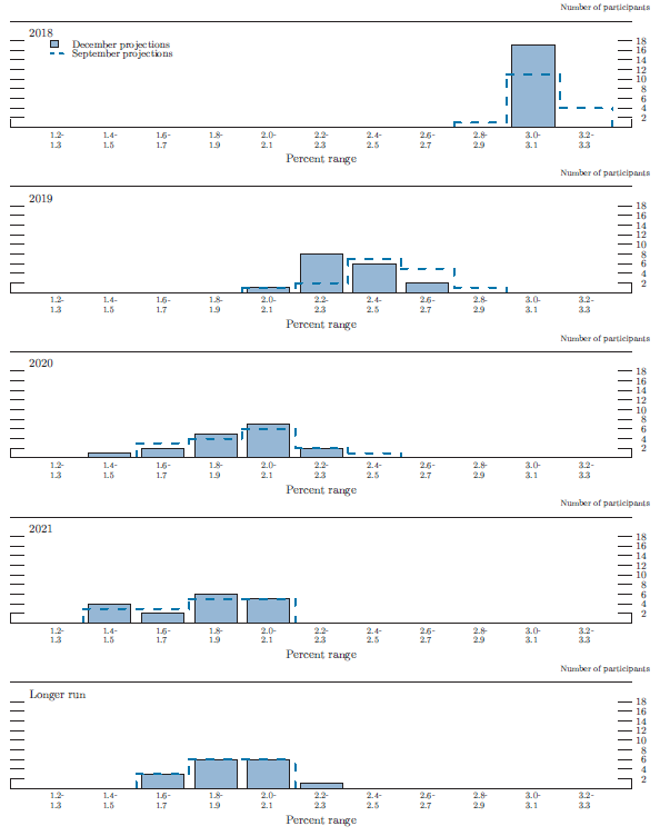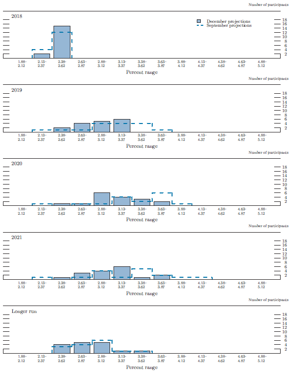 Figure 3.E shows distributions of participants' judgments regarding the appropriate target--or midpoint of the target range--for the federal funds rate at the end of each year from 2018 to 2021 and over the longer run. The distributions for 2019 through 2021 were less dispersed and shifted slightly toward lower values. Compared with the projections prepared for the September SEP, the median federal funds rate was 25 basis points lower over the 2019-21 period. For the end of 2019, the median of federal funds rate projections was 2.88 percent, consistent with two 25 basis point rate increases over the course of 2019. Thereafter, the medians of the projections were 3.13 percent at the end of 2020 and 2021. Most participants expected that the federal funds rate at the end of 2020 and 2021 would be modestly higher than their estimate of its level over the longer run; however, many marked down the extent to which it would exceed their estimate of the longer-run level relative to their September projections. The median of the longer-run projections of the federal funds rate was 2.75 percent, 25 basis points lower than in September.